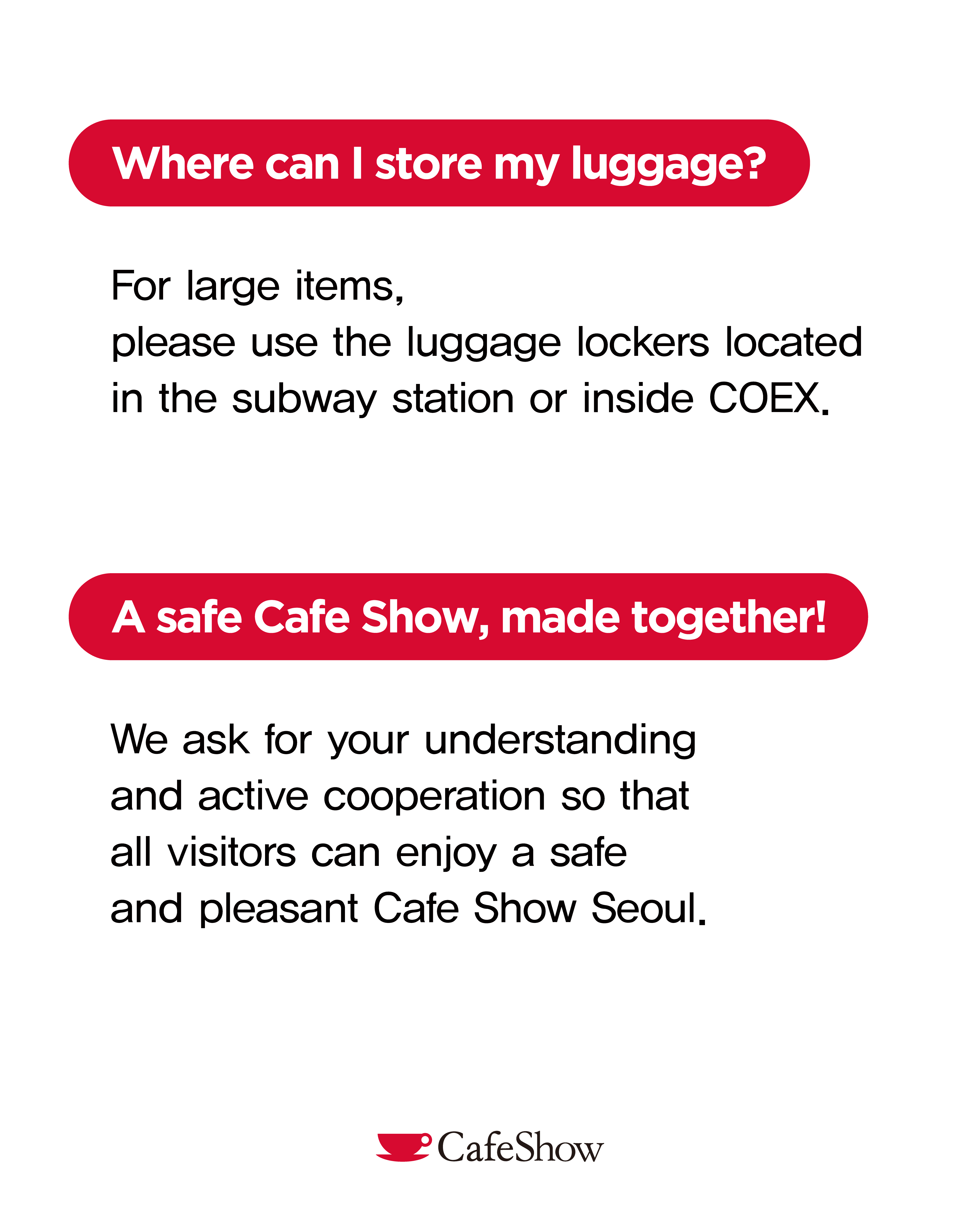 We kindly ask for your cooperation so that everyone can enjoy a safe and pleasant Cafe Show Seoul! ※ If you need to store personal belongings, please use the luggage storage facilities.
