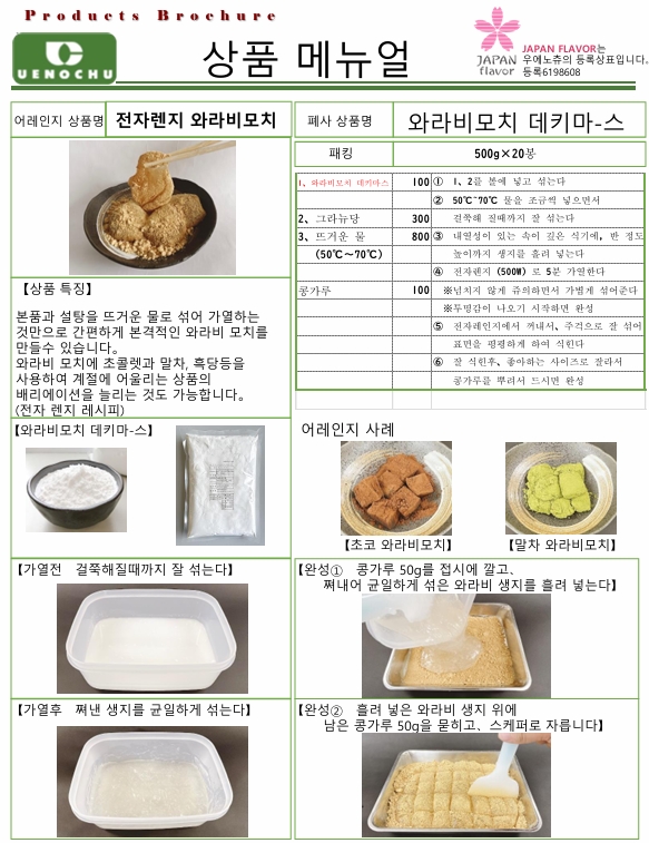 Warabi Mochi is a traditional Japanese confection made from bracken starch. While it is generally purchased as a finished product from traditional confectionery shops or supermarkets, Warabi Mochi Dekimasu is a pre-mix product that allows anyone?from cafes and restaurants to households?to easily make authentic warabi mochi. it is enjoyed not only as a dessert but also as a substitute for tapioca in beverages and as a versatile topping for drinks