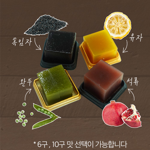 A premium dessert crafted by Lee Jong-hwa, Korea’s nationally recognized Master Confectioner from Goheung. These handmade yokan are free from preservatives and artificial coloring, combining both health and taste. The assortment includes flavors such as pomegranate, black sesame, green pea, and yuzu (Korean citrus), each made with delicately prepared fillings.