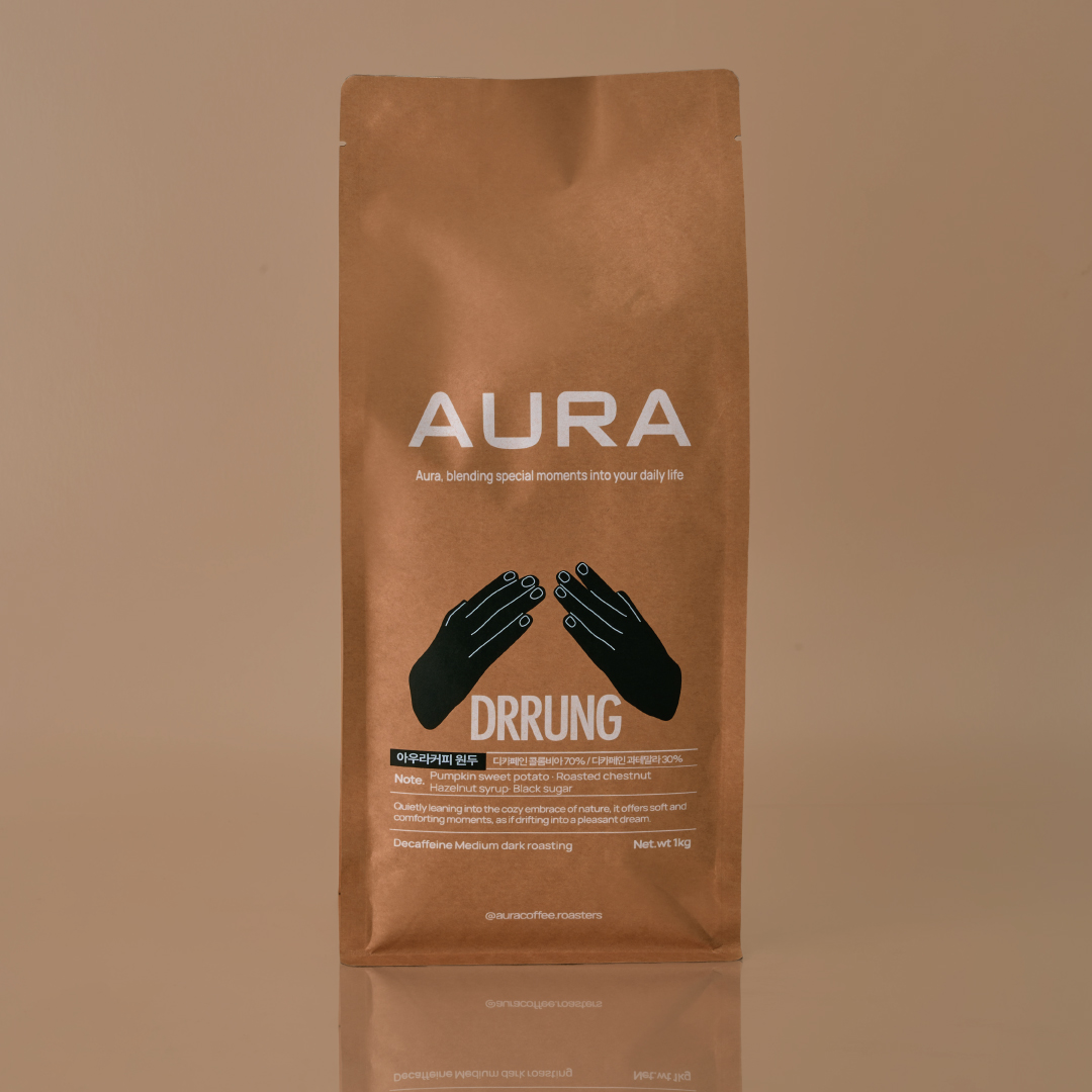 DRRUNG ? Decaf Medium Dark Decaf Colombia 70% · Decaf Guatemala 30% Sweet potato and roasted nuts meet honey floral and a touch of mugwort. This decaf blend brings gentle sweetness and calm balance so you can enjoy rich taste without caffeine. Tasting Notes Sweet Potato · Roasted Nuts · Honey Floral · Mugwort Fragrance ★★★★☆ · Sweetness ★★★★☆ · Acidity ★★☆☆☆ · Body ★★★☆☆ Aura’s Comment DRRUNG offers warmth and comfort with mellow sweetness and floral notes a soothing choice anytime.