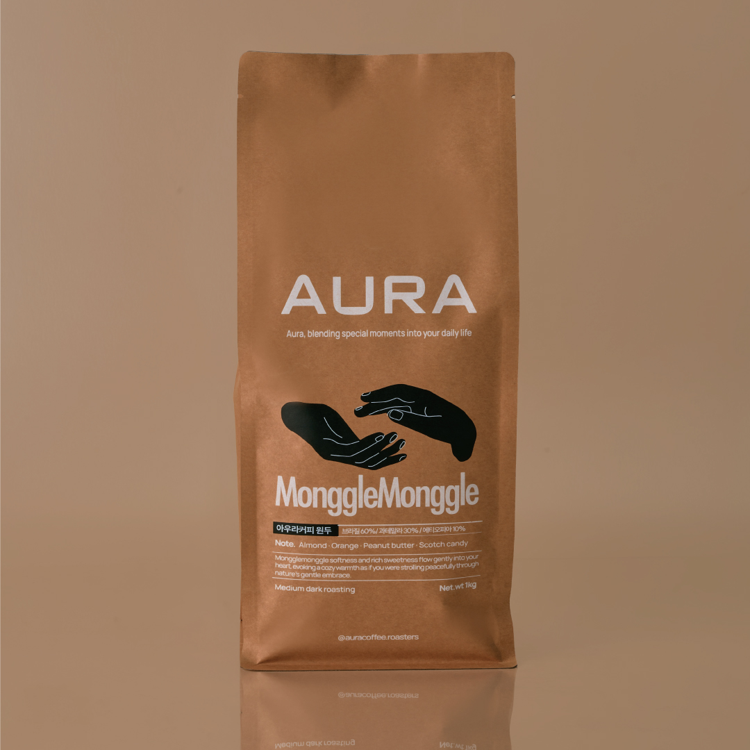 MonggleMonggle ? Medium Dark Brazil 70% · Guatemala 30% A smooth blend where almond and peanut butter meet the sweetness of orange and butterscotch candy. It delivers a cozy comforting moment as if wrapped in the gentle aura of nature. Tasting Notes Almond · Peanut Butter · Orange · Butterscotch Candy Fragrance ★★★☆☆ · Sweetness ★★★★★ · Acidity ★★☆☆☆ · Body ★★★★☆ Aura’s Comment MonggleMonggle charms with its nutty texture and sweet balance offering a gentle sense of comfort in every sip.