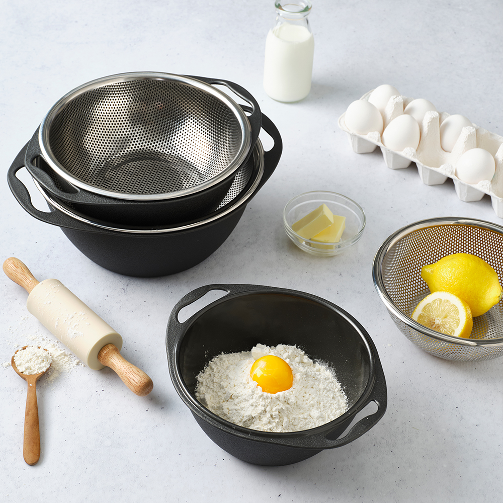 ALL-IN-ONE sieve & bowl set Dual-handled handles reduce wrist strain Wide base for stable use Modern design with a stone-like texture