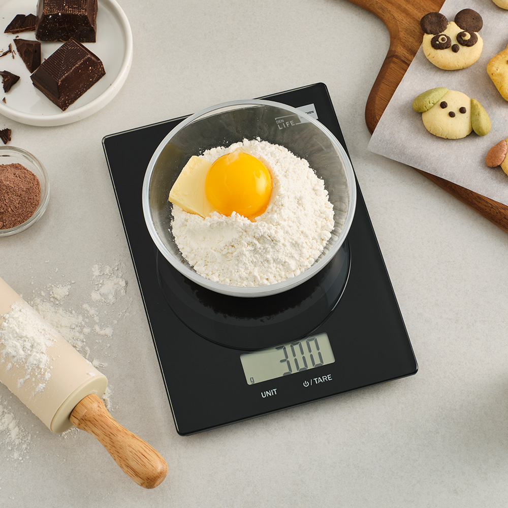 Hygienic and durable tempered glass Maximum load capacity of 1kg for measuring various materials Dual unit measurement of g/ml TARE function for measuring by subtracting the weight of the container Wide measuring plate provides a secure field of view